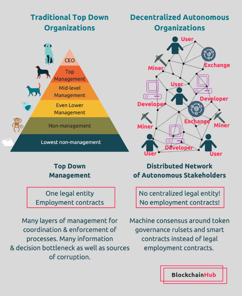 As our last blog post mentioned, a DAO (Decentralized Autonomous Organization) is an organization represented by rules encoded as a transparent computer program, controlled by the organization members, and not influenced by a central government. As the rules are embedded into the code, no managers are needed, thus removing any bureaucracy or hierarchy hurdles.